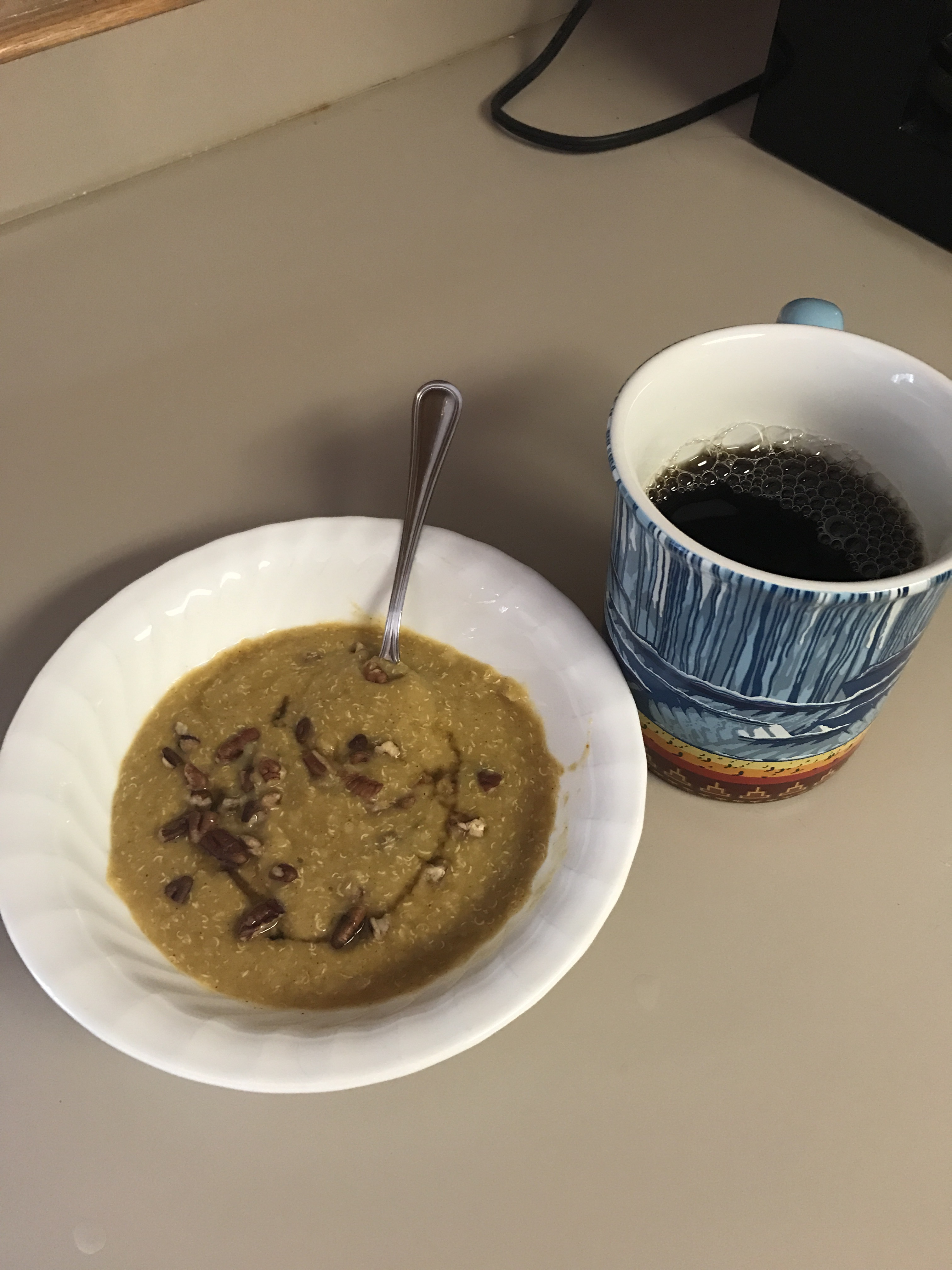My tooth might be very tender for a few days so I wanted something soft to eat today. Like ice cream. But that would have required that I leave the house. And the couch. So instead, I googled some ingredients I had in the house: quinoa flakes, oatmeal, pumpkin purée, maple syrup, cashew milk. And a recipe popped up for this maple pecan quinoa.