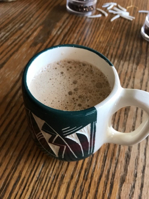 I’m still hanging tough with the no artificial sweetener, and I am still free of the strong sugar cravings I once had (M&M cookies from HyVee and Snickers candy bars were my go-to faves). I used to get a strong sugar craving mid-afternoon and I usually satisfied that craving with some kind of sugar-laden coffee from any number of the coffee shops here in my town. I have not had a sugar craving, but the weather got cold here 2 days ago and I wanted a hot, creamy, comforting drink. I didn’t want hot green or mint tea, and I didn’t want black coffee. I wanted something that reminded me of cuddling up on the couch with a fluffy blanket or my star quilt, and one of my big puppies. I didn’t necessarily want sugar, but rather some comforting beverage in a pretty mug.